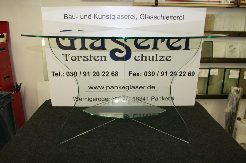 Der Begriff“ Glasdesign“ beinhaltet bei uns die Anfertigung von Glasmöbeln, spezieller Glaskonstruktionen, Tischplatten usw. Die hierzu nötigen Arbeitstechniken - wie Schleifen, Bohren, Klebungen mit UV-Kleber, speziellen Klebebändern, Silicon usw. führen wir selbst in unseren Werkstätten aus. Dadurch sind wir in der Lage, Kundenwünsche zu erfüllen, die industriell nicht mehr möglich sind. Die Anfertigung technischer Sondergläser mit Maßtoleranzen von maximal 0,2 mm ist nicht unmöglich. Sie haben eine Idee? Wir versuchen, sie umzusetzen.